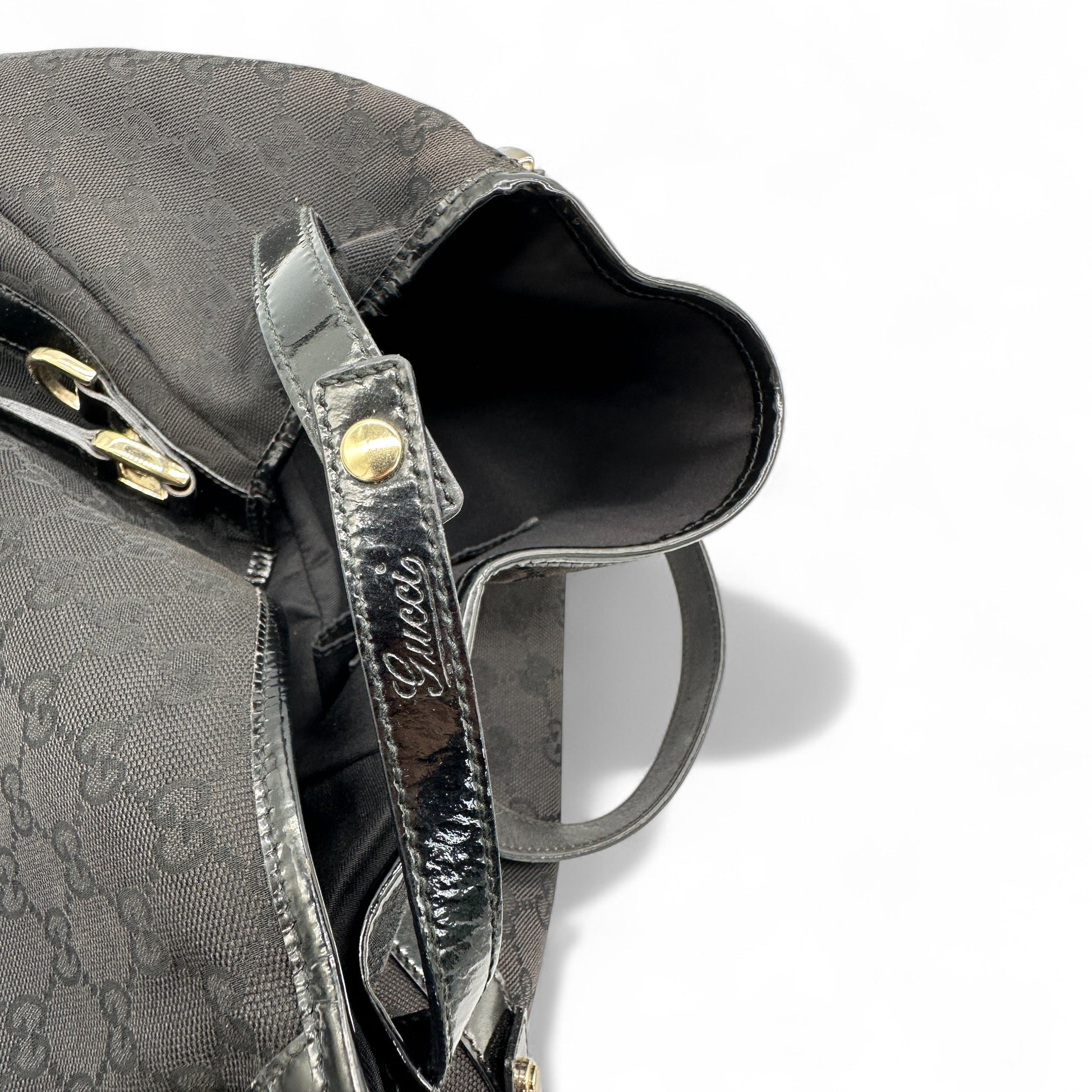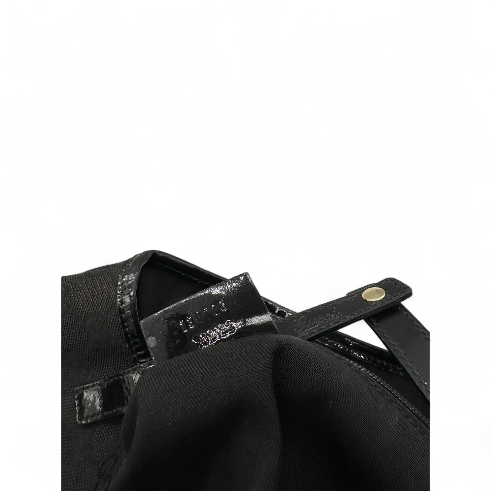 Vintage Gucci Abbey 130736 Tote Shoulder Bag. In black GG monogram, trimmed with patent black leather and silver D-ring hardware. A large Gucci silhouette, with a strapped button closure.