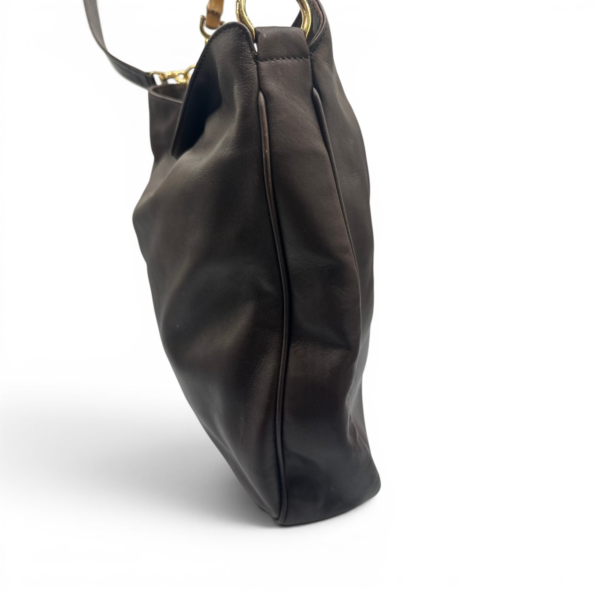 A classic Gucci Bamboo 2 way tote in smooth dark brown leather, featuring the iconic curved brown bamboo top handle and brass hardware.