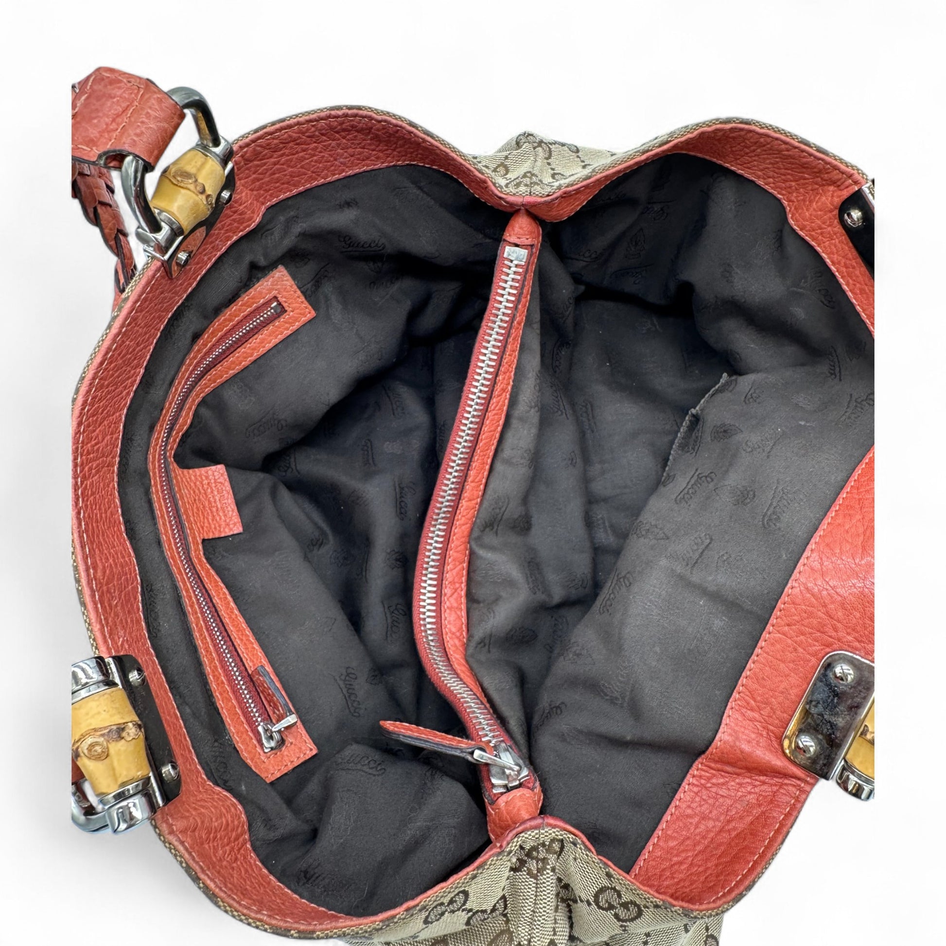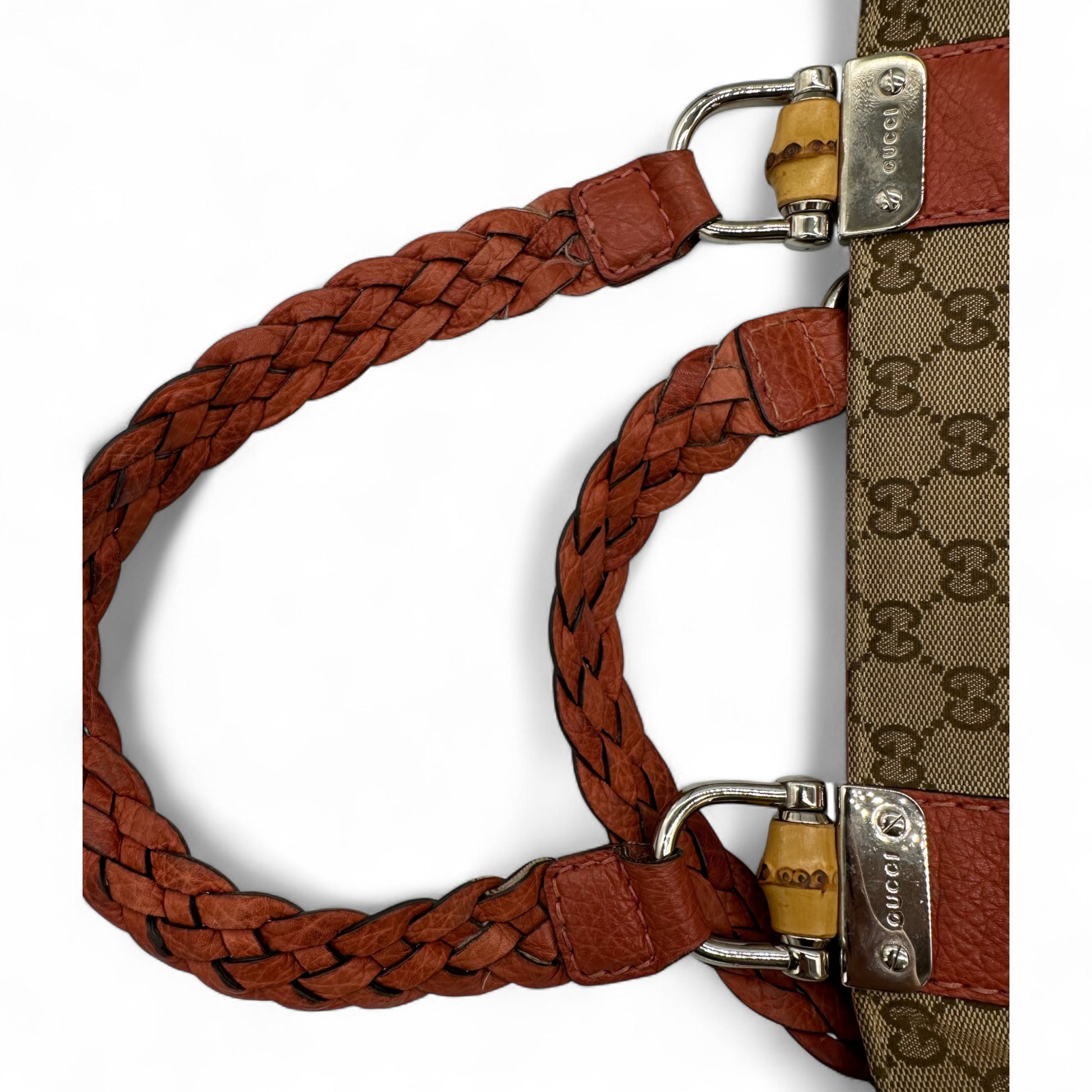 Vintage Gucci Bamboo Tote 232947 Shopper Bag. In brown and beige GG monogram, trimmed with orange leather and bamboo accent. With braided double top handles, this spacious Gucci tote bag can be used as a handbag or shoulder bag.