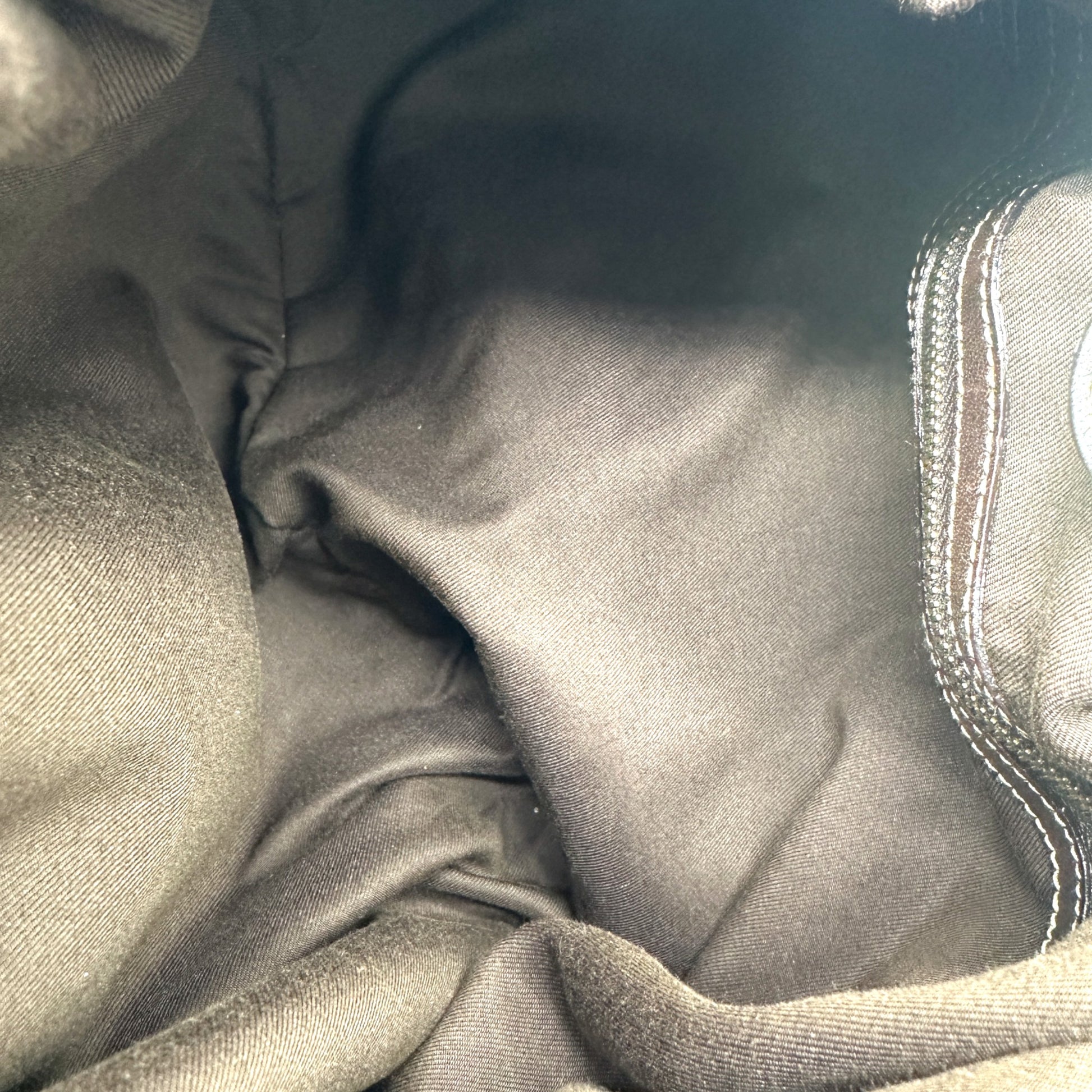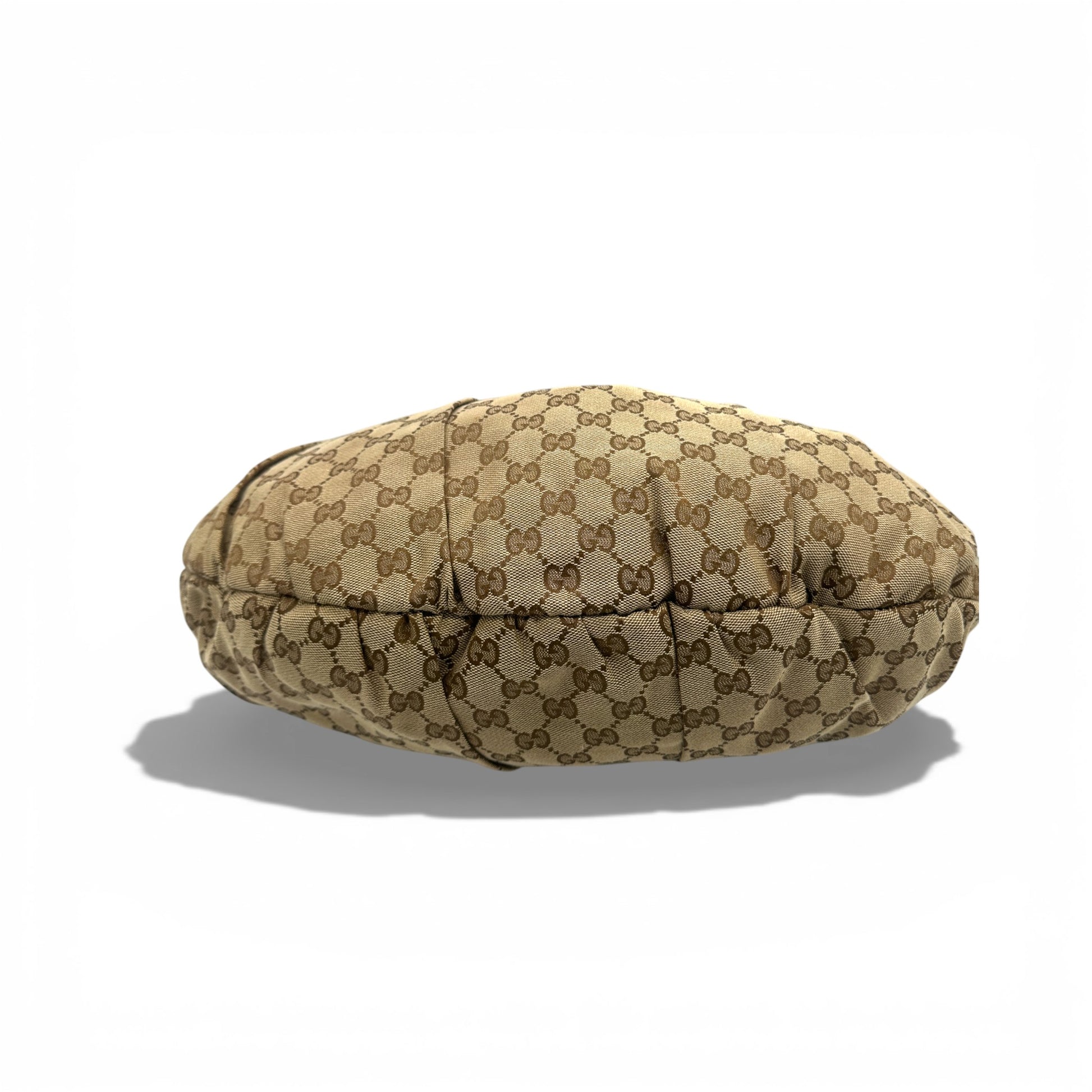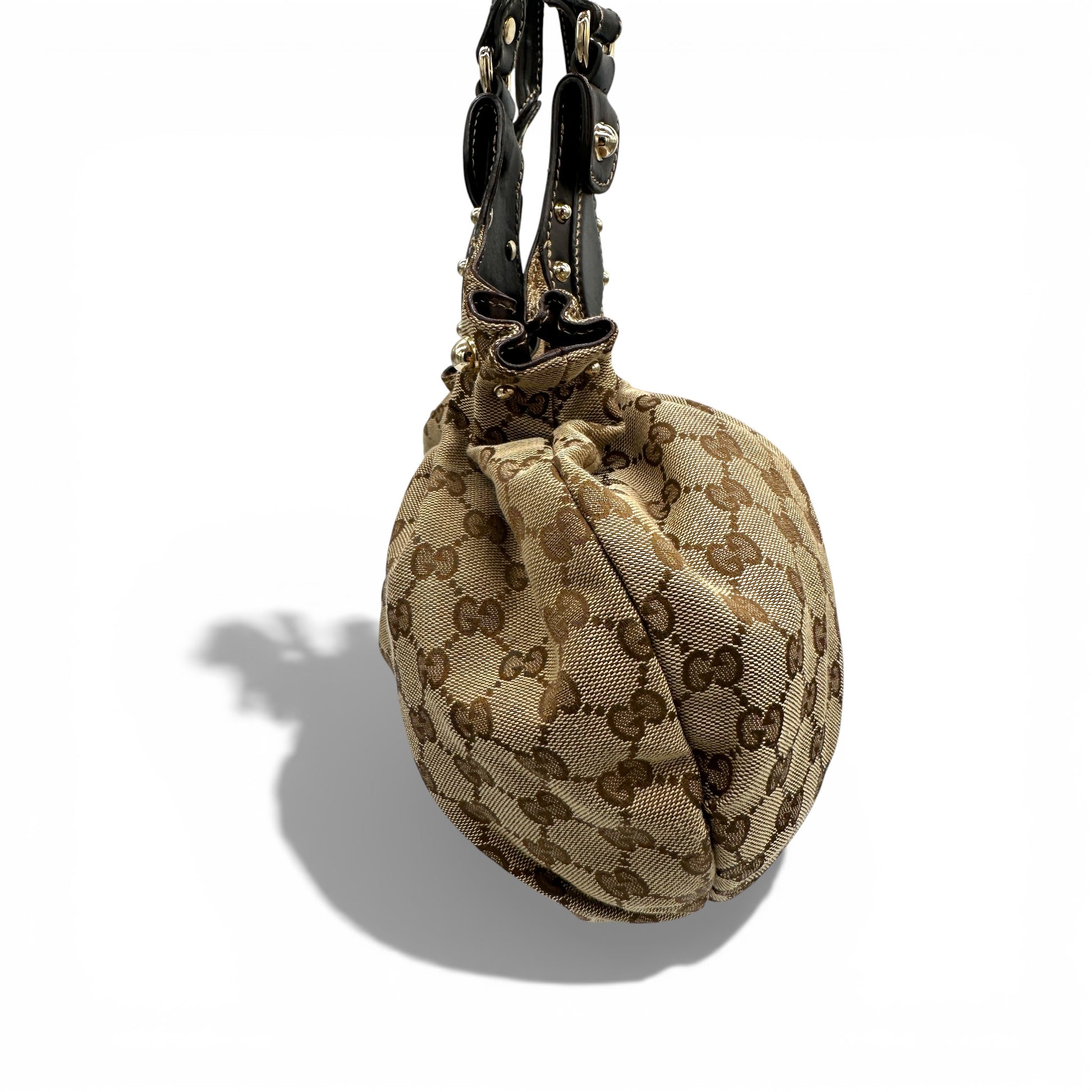 Vintage Gucci Pelham 203624 Handbag. In brown and beige GG monogram, trimmed with dark brown leather and metal studded accents. With double rolled top handles, this slouchy Gucci silhouette can be used as a handbag or worn comfortably as a shoulder bag. Comes with button snap closure.