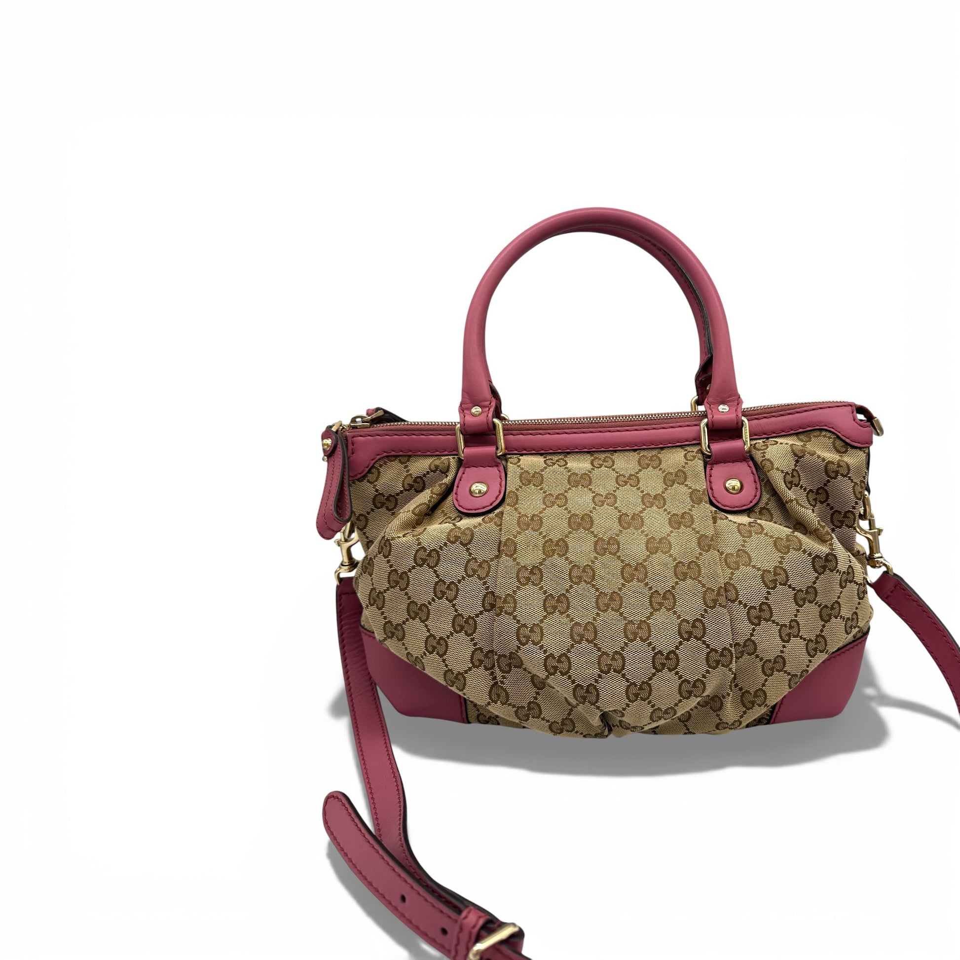 Vintage Gucci Sukey 247902 Shoulder Bag. In brown and beige GG monogram canvas, trimmed with pink leather and gold-tone hardware, with Gucci key charm. This slouchy silhouette can be used as handbag or shoulder bag with detachable leather strap.