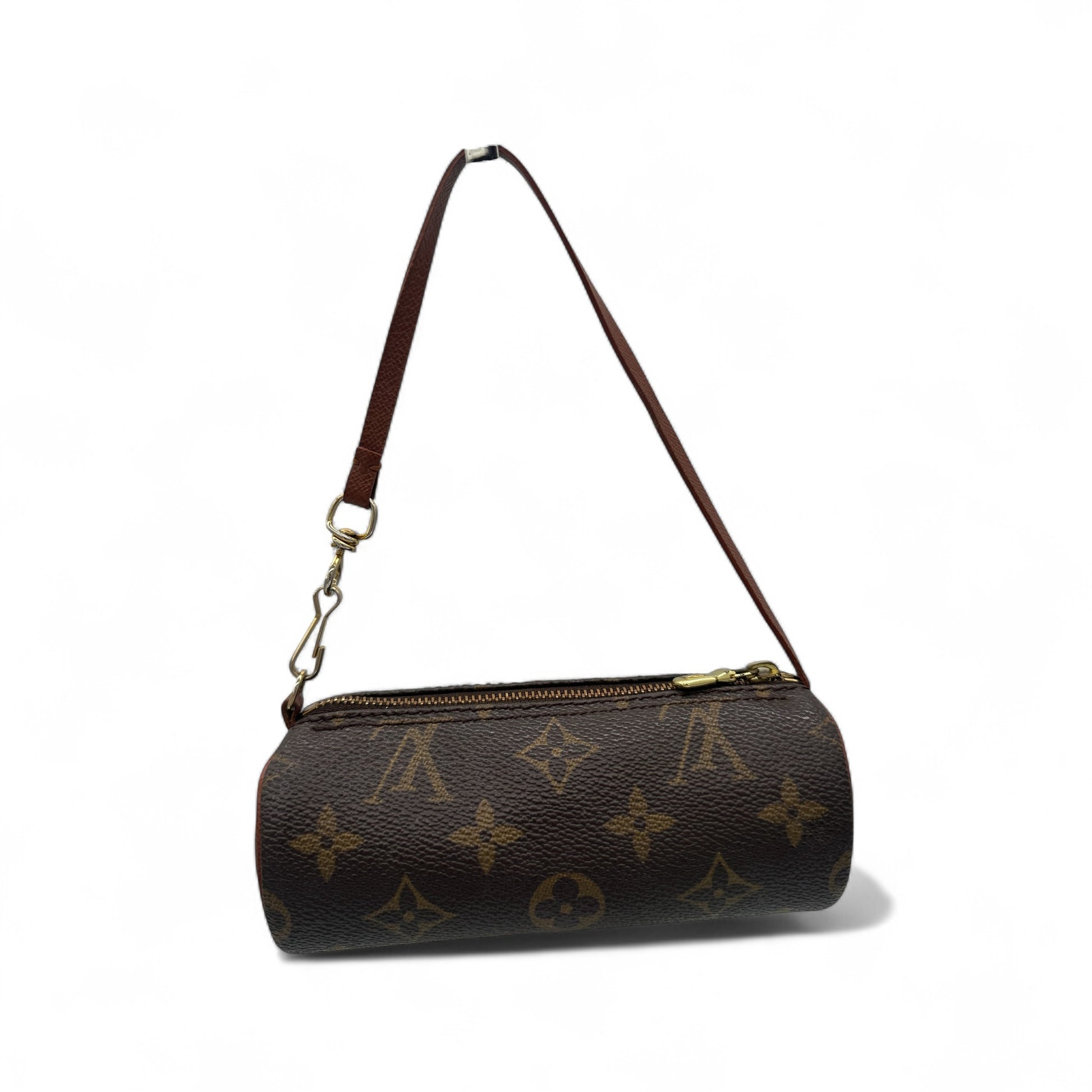 Model and style: Vintage Louis Vuitton Mini Papillon Wristlet in Monogram. With gold coloured hardware and clip clasp strap.