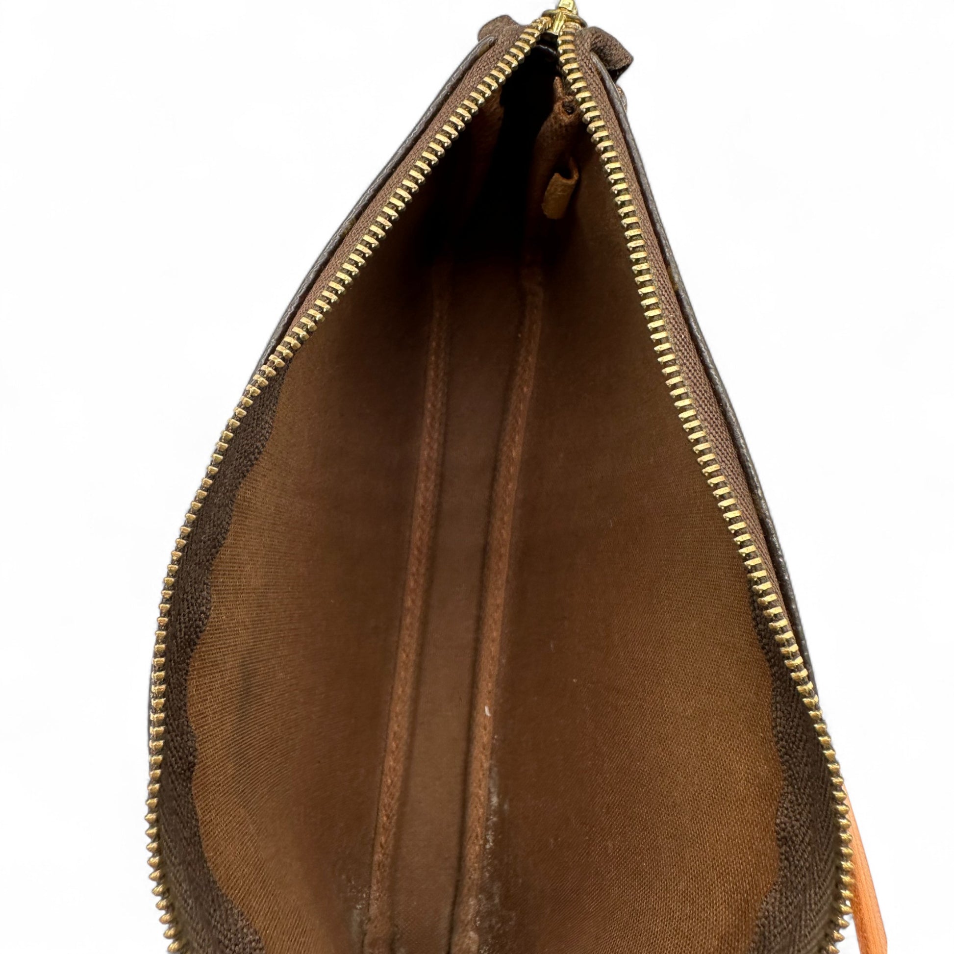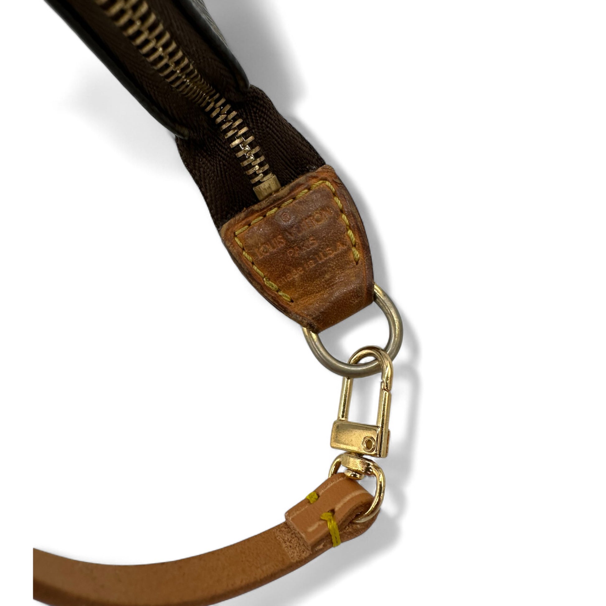 Vintage Louis Vuitton Pochette Accessoires Shoulder Bag. In brown signature LV monogram, trimmed with brown vintage patina leather and gold coloured hardware.