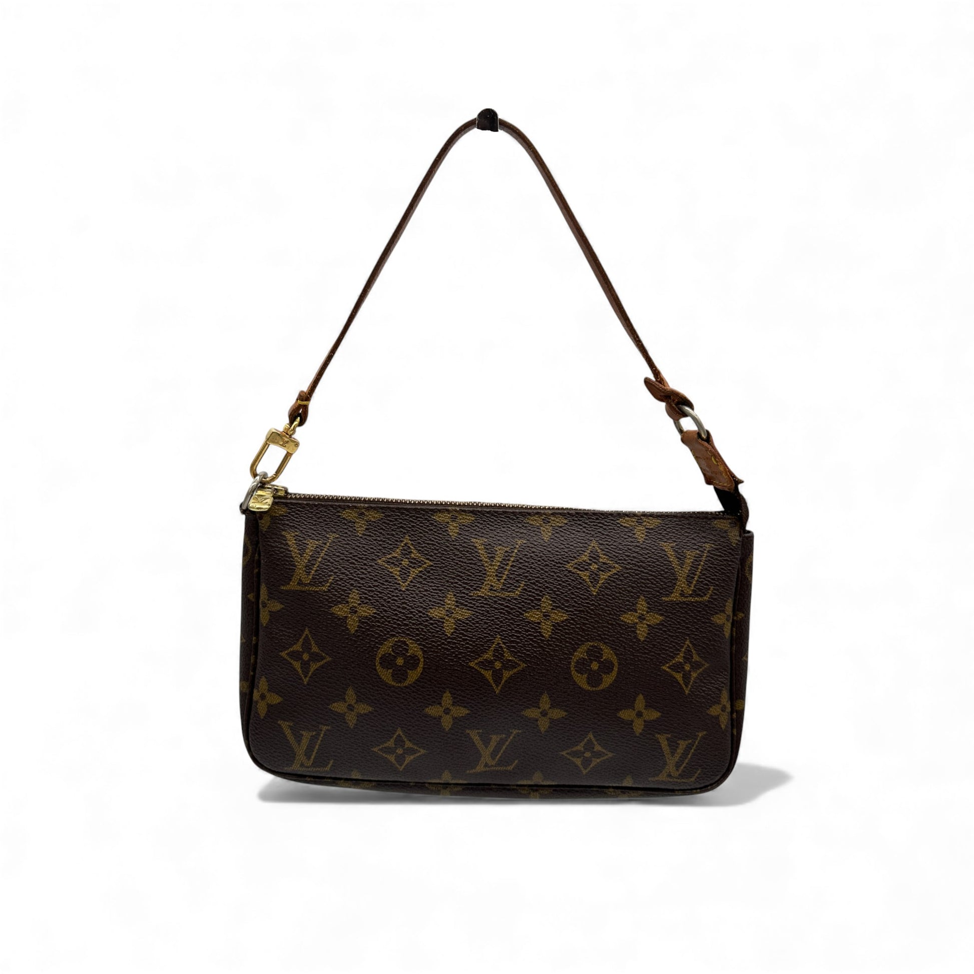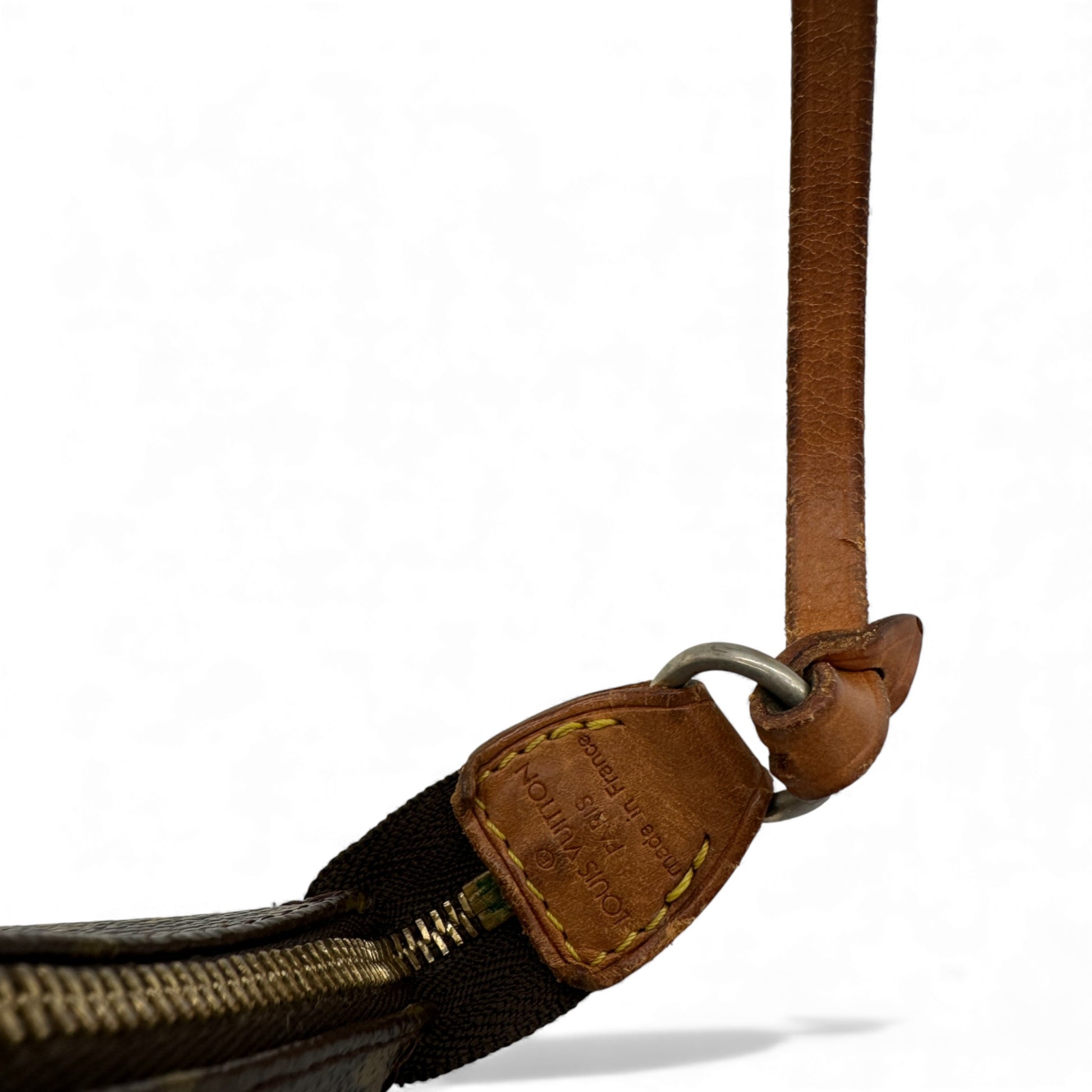 Vintage Louis Vuitton Pochette Accessoires Shoulder Bag. In brown signature LV monogram coated canvas, trimmed with brown vintage patina leather and gold-tone hardware.