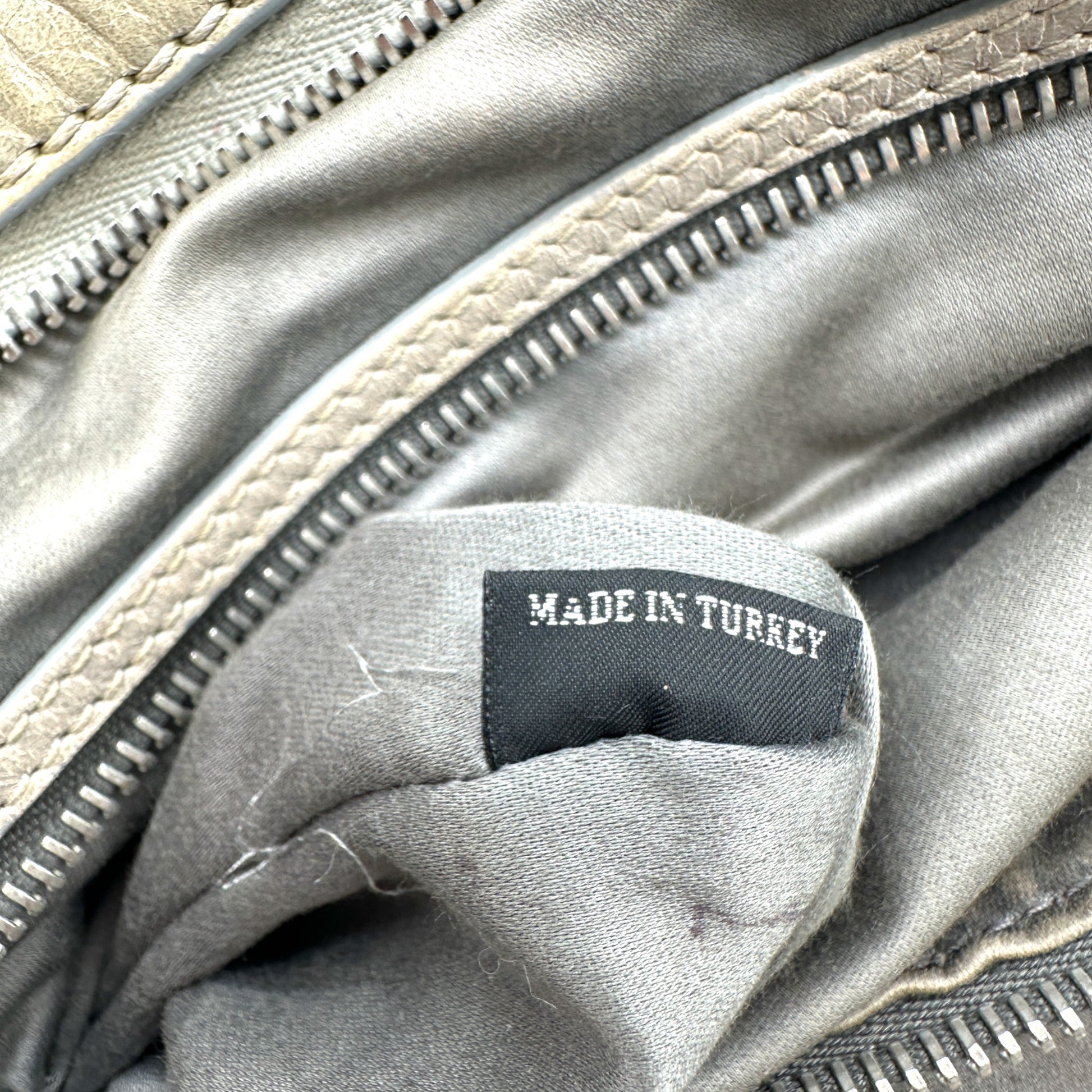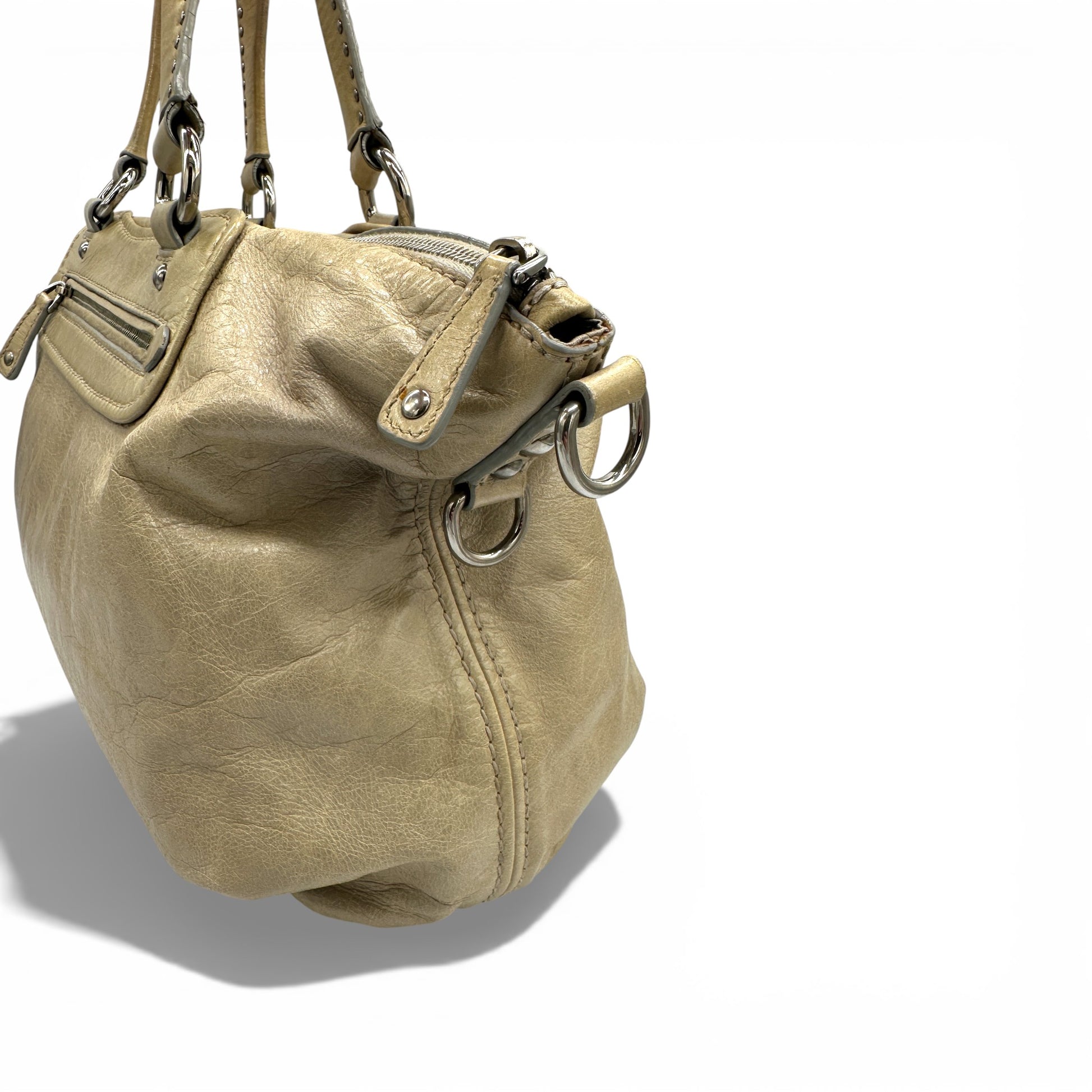 Vintage Miu Miu Vitello 2-Way Handbag. In soft Cammeo green toned beige Vittello (calfskin) leather. With silver-tone hardware, and heart charm zipper accessory. With metal studded leather double top handles, it can be worn as a handbag with the shorter strap or on the shoulder, with detachable crossbody strap. Please note the colour of the leather on this bag appears more green toned under some lights and beige in others.