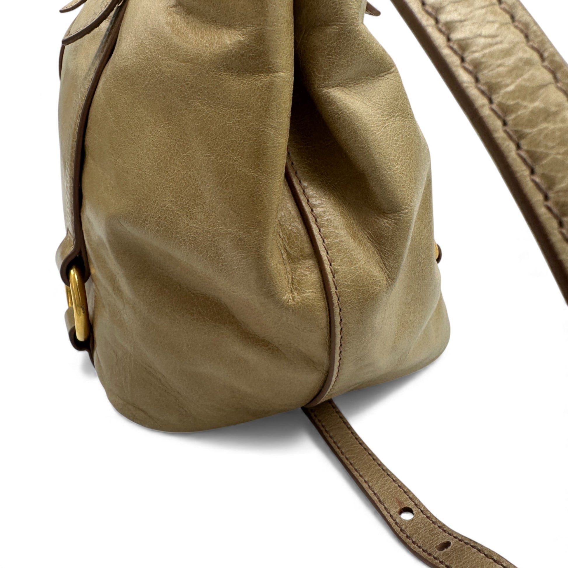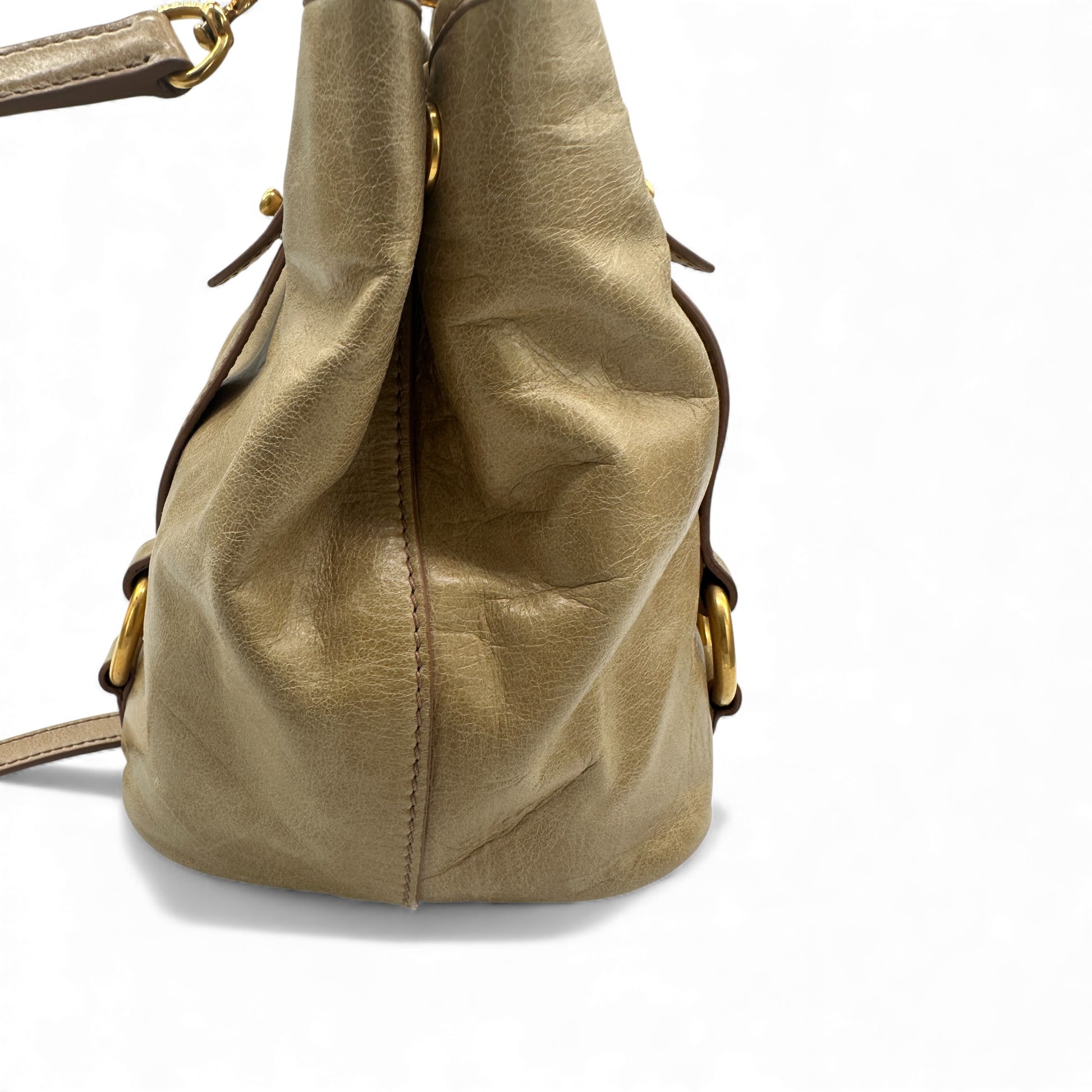 Vintage Miu Miu Vitello Shine 2-Way Handbag. In soft Cammeo beige Vittello (calfskin) leather. With gold-tone hardware and rolled leather double top handles, it can be worn as a handbag with the shorter strap or on the shoulder, with additional detachable crossbody strap. Made in Italy.