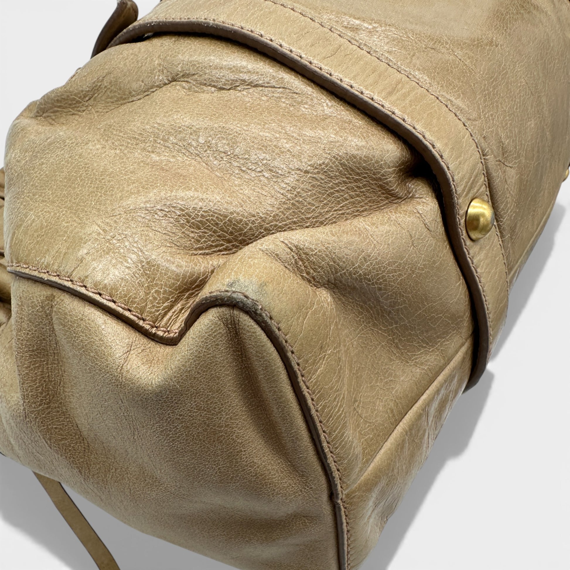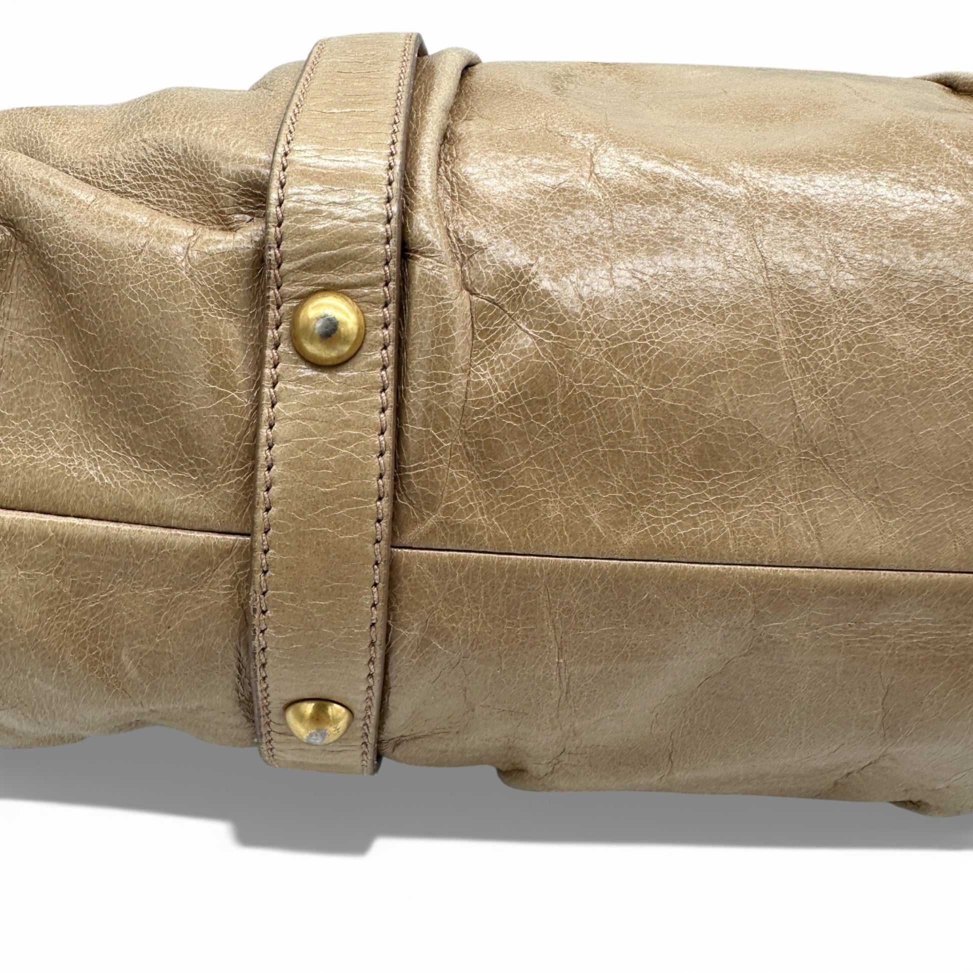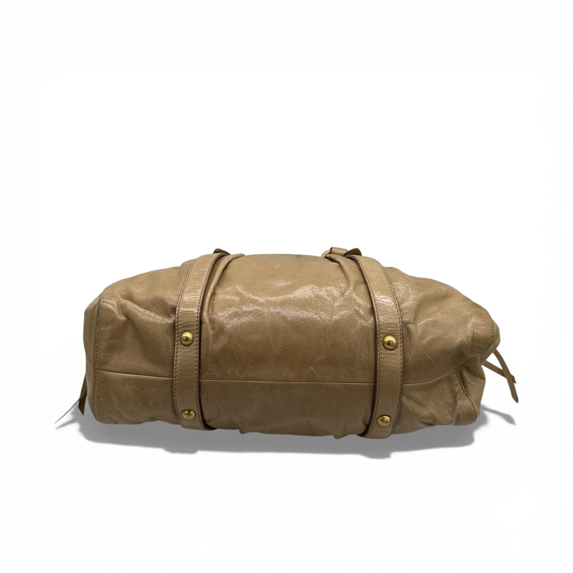 Vintage Miu Miu Vitello Shine 2-Way Handbag. In soft Cammeo beige Vittello (calfskin) leather. With gold-tone hardware and rolled leather double top handles, it can be worn as a handbag with the shorter strap or on the shoulder, with additional detachable crossbody strap. With pleated top and drawstring detail.