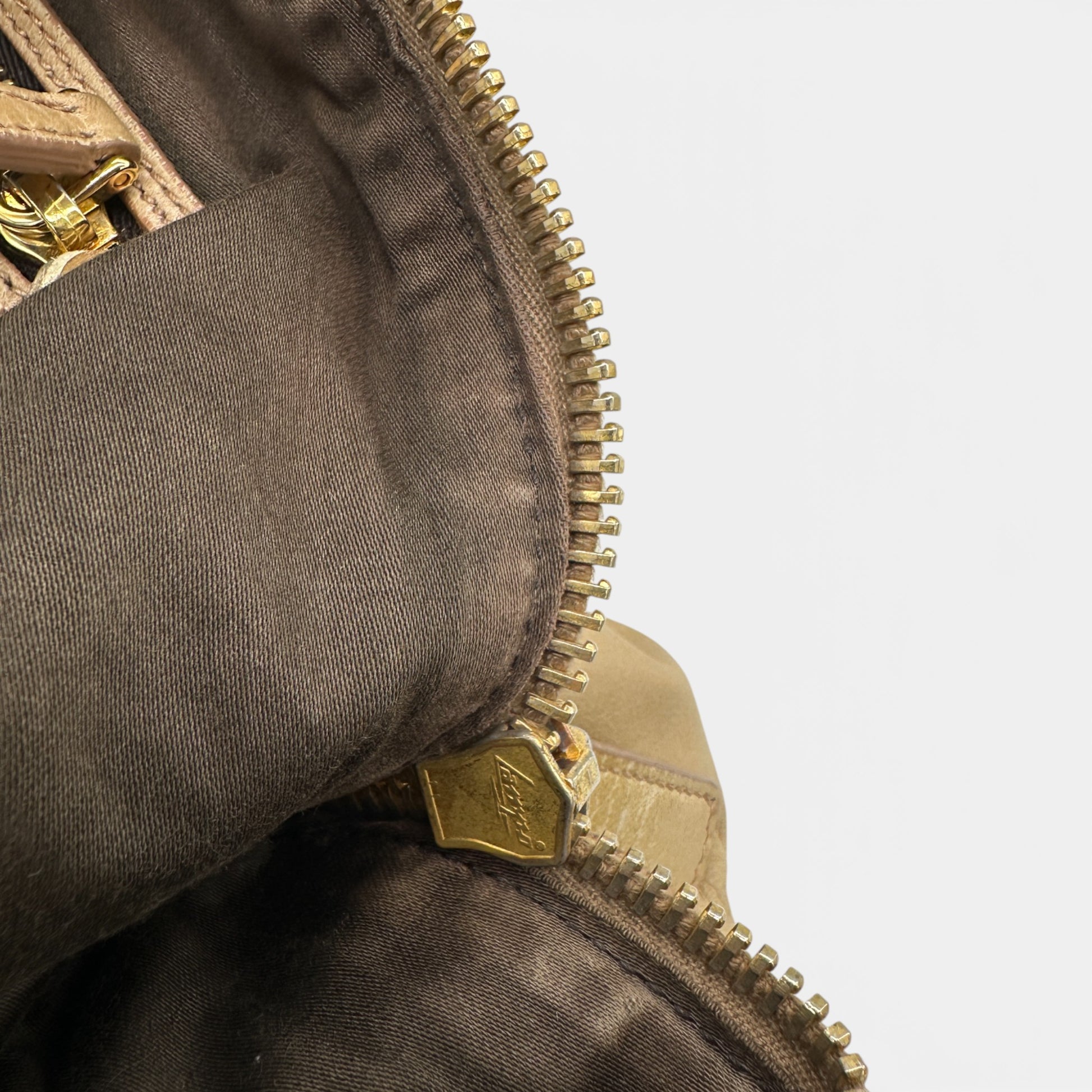 Vintage Miu Miu Vitello Shine Handbag. In distressed Cammeo beige Vittello Shine (calfskin) leather. With gold-tone hardware and rolled leather double top handles, which can be used as a handbag or worn comfortably on the shoulder.