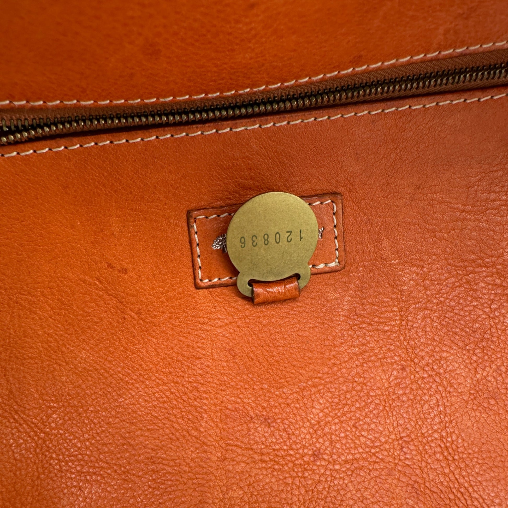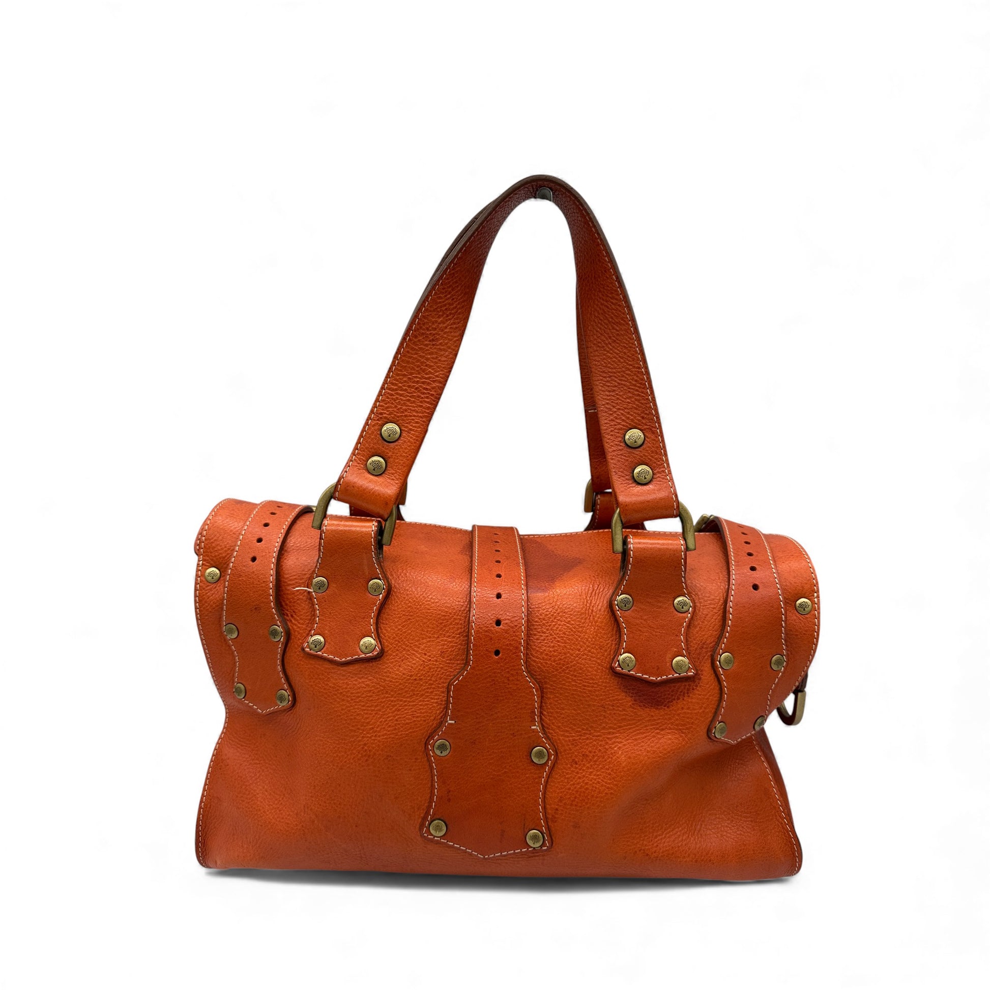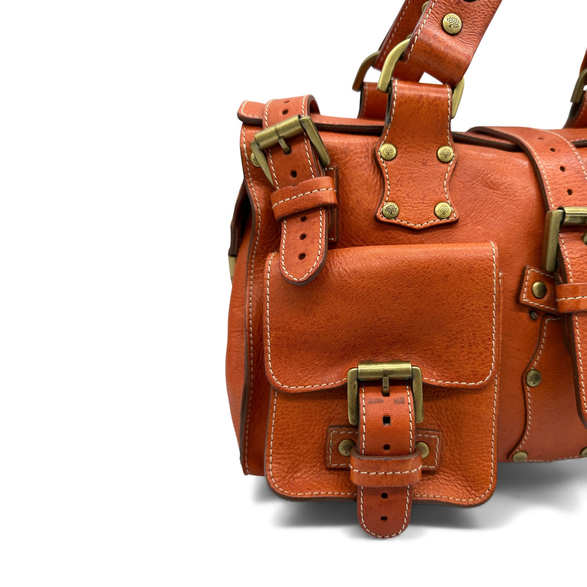 Vintage Mulberry Roxanne Handbag. In tan natural vegetable tanned leather, with front pockets and brass buckle and stud hardware detailing.